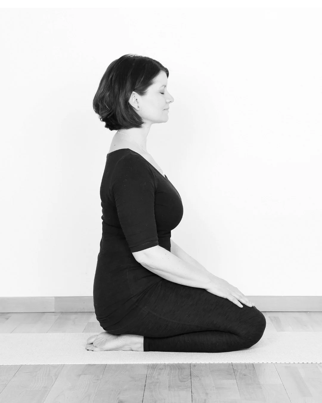 Sæt dig på hælene med fødderne ind under dig. Brug evt. en blok eller pude under bagdelen, evt. et tæppe mellem lår og lægge. Bliv siddende her et par minutter og lad maven være blød. Tag nogle rolige lange vejrtrækninger dybt ned i maven.