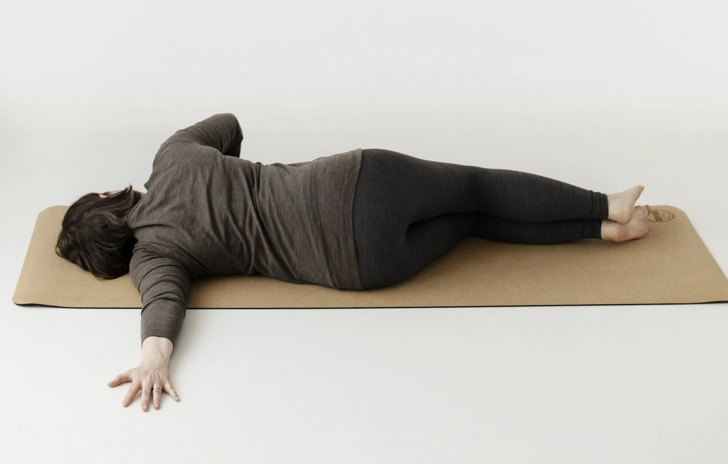Bliv liggende i 3-5 min. og skift til modsatte side, evt. med en pause imellem, hvor du tager armene ned langs siden. Når du har lavet begge sider, kan du blive liggende et minuts tid på ryggen i rebound.