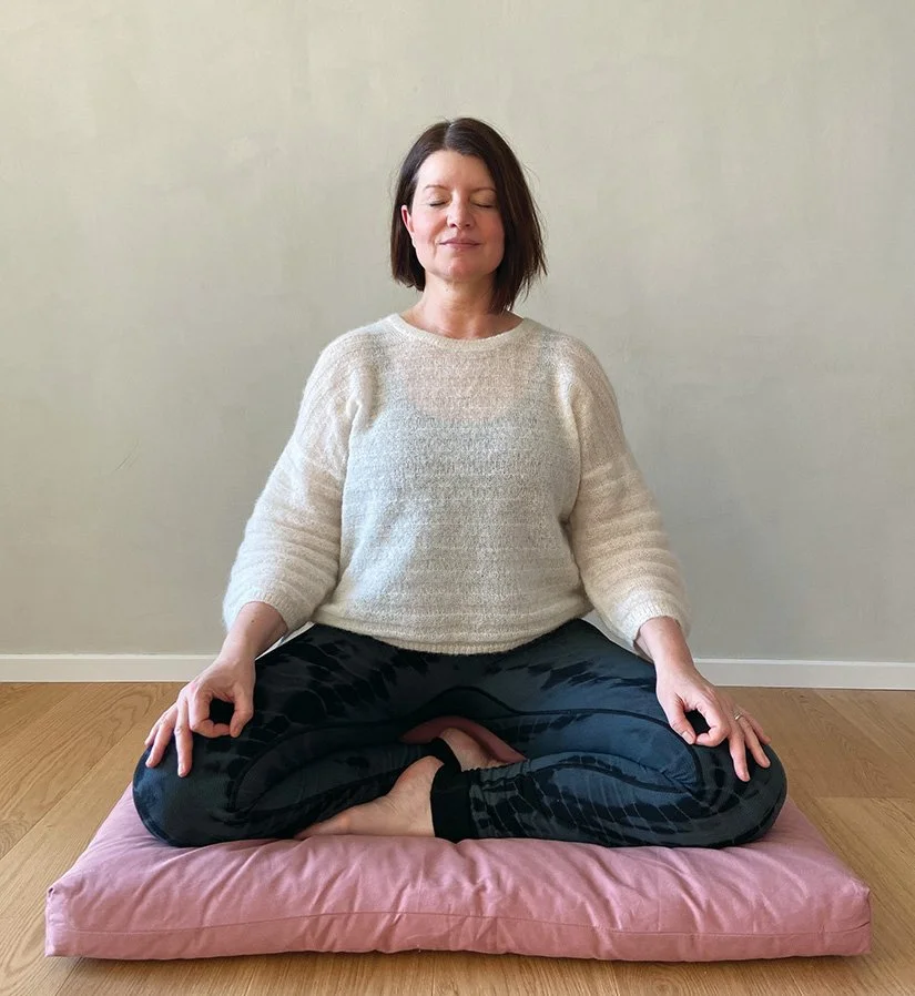 Du kan også vælge en højere meditationspude, hvis du har brug for at få hofterne løftet mere op. Det er både en smagssag og kommer også an på, hvor åben du er i hofterne.